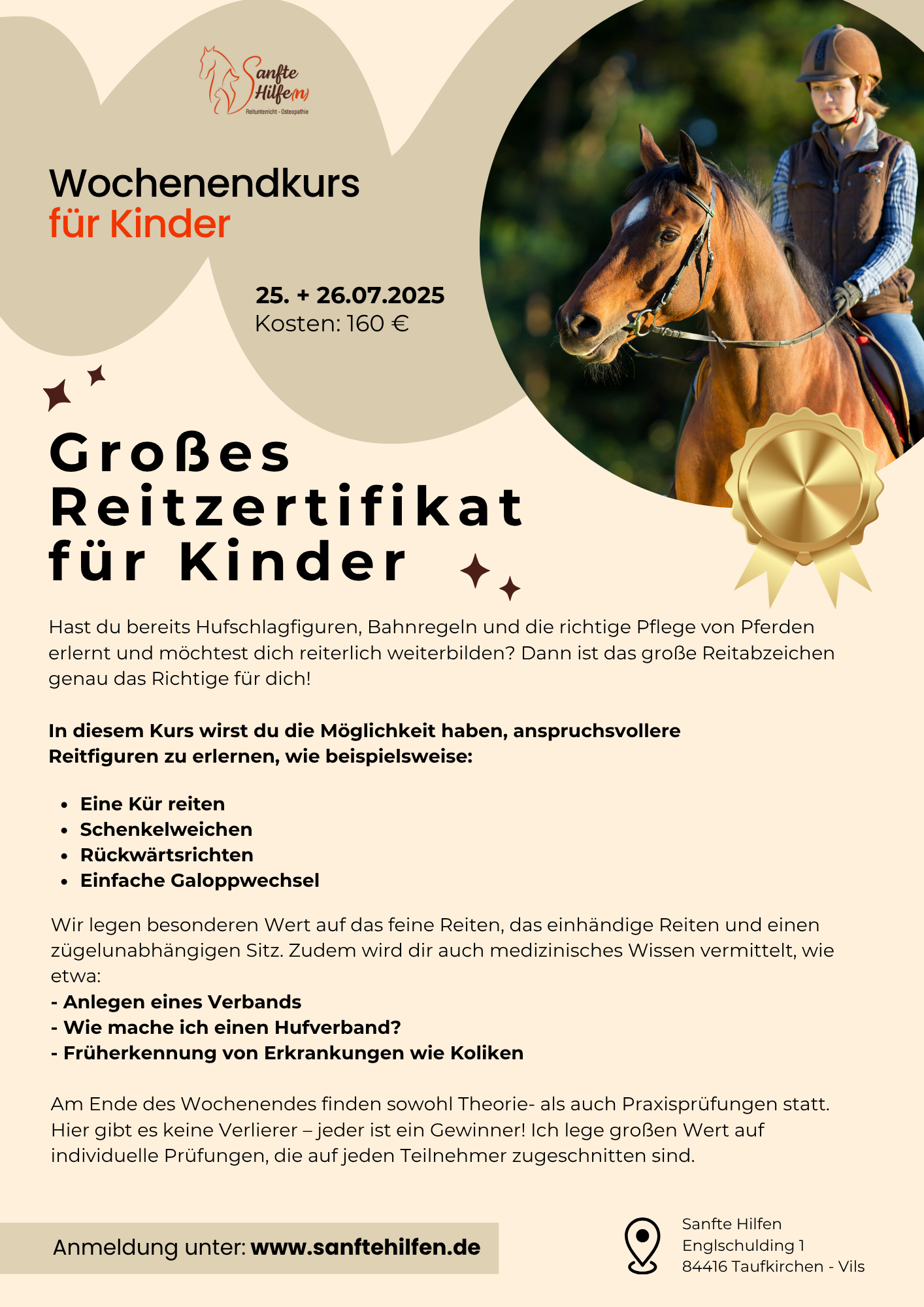 Hast du bereits Hufschlagfiguren, Bahnregeln und die richtige Pflege von Pferden erlernt und möchtest dich reiterlich weiterbilden? Dann ist das große Reitabzeichen genau das Richtige für dich!
