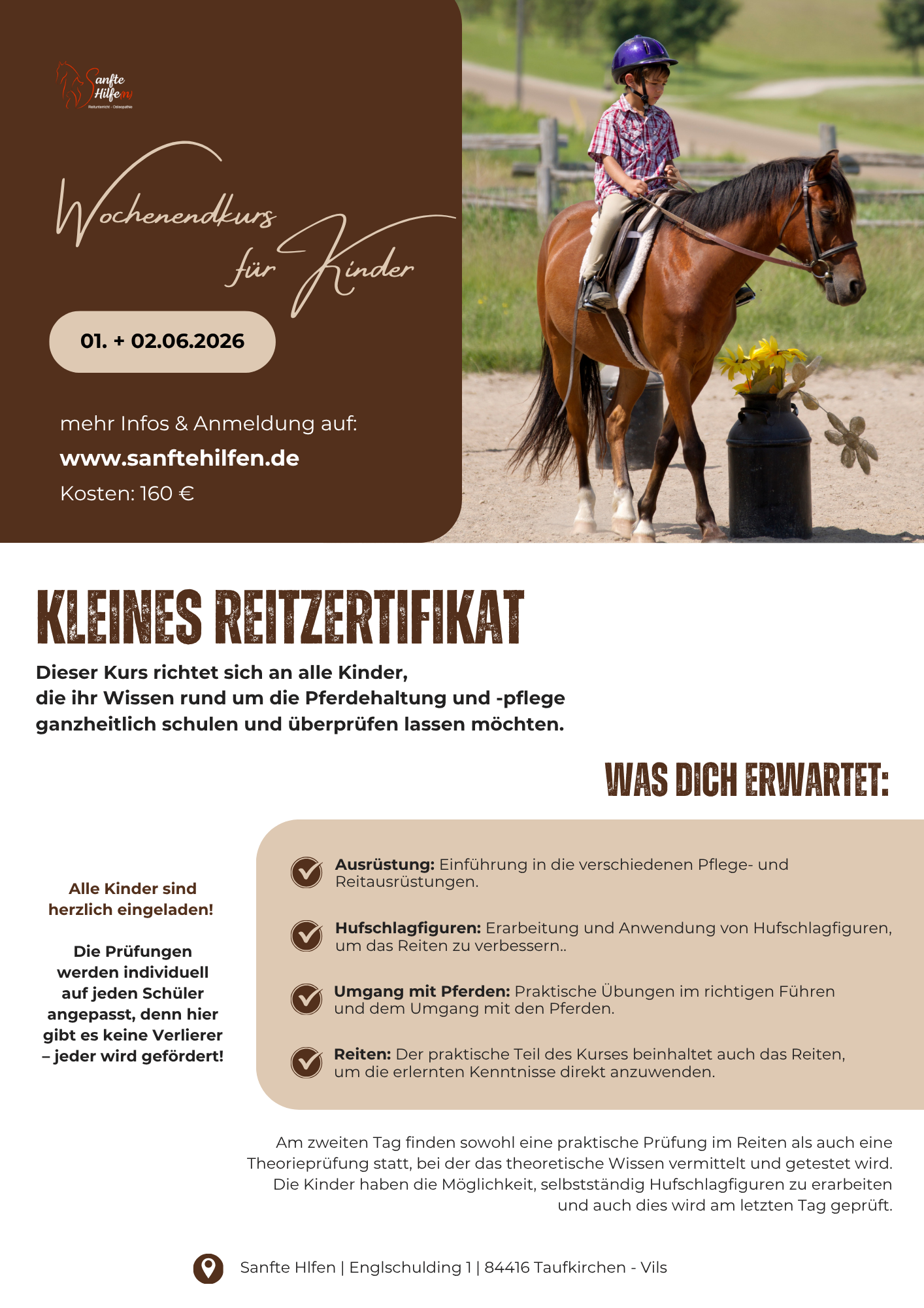 Dieser Kurs richtet sich an alle Kinder, die ihr Wissen rund um die Pferdehaltung und -pflege ganzheitlich schulen und überprüfen lassen möchten.